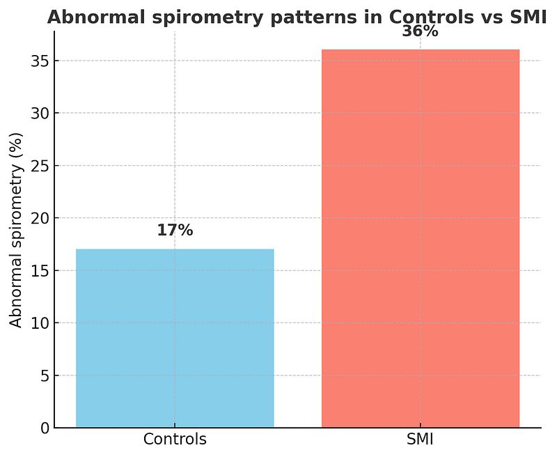 - 36% of individuals with SMI had abnormal spirometry results (versus 17% of controls).